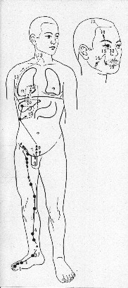 Decorso Meridiano Fegato: Il meridiano di fegato è composto da 14 punti di agopuntura. Parte dal lato ungueale interno dell'alluce (F:1) salendo sul piede tra il 1° e il 2° metatarso fino alla caviglia fra i tendini del muscolo tibiale anteriore e il muscolo estensore lungo dell'alluce. Prosegue la sua ascesa sulla gamba dietro il bordo mediale della tibia fino al ginocchio e proseguendo lungo l'interno coscia fino al pube. Gira intorno agli organi genitali e sale esternamente ai muscoli addominali in direzione della gabbia toracica per terminare sulla verticale del capezzolo nel 6° spazio intercostale (F:14)