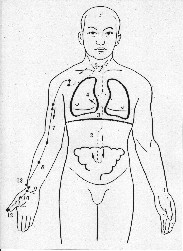 Decorso meridiano polmone: E composto da 11 punti di agopuntura. Il Meridiano parte 2 dita sotto la clavicola a 6 cun dalla linea di mezzeria del torace. P1. Risale sotto la clavicola stessa. P2. Discende lungo il lato del braccio esternamente al muscolo bicipite; raggiunge la fossa cubitale (P5) all'altezza della piega del gomito. Prosegue lungo l'avambraccio sempre esternamene dalla parte del pollice, raggiungendo l'articolazione del polso. P9. Prosegue sull'eminenza tenar del pollice per terminare al lato dell'unghia del pollice sempre esternamente.
